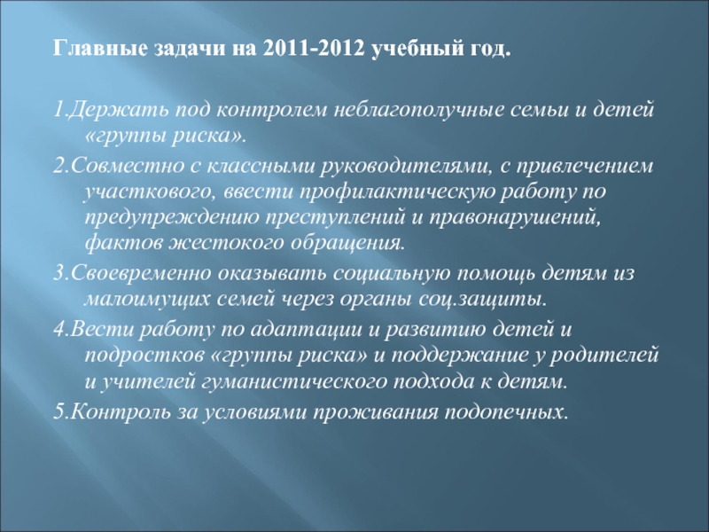 1.Держать под контролем неблагополучные семьи и детей «группы риска».