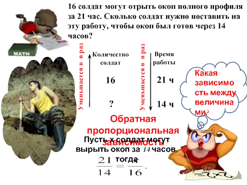 Пусть х солдат могут вырыть окоп за 14 часов, тогда