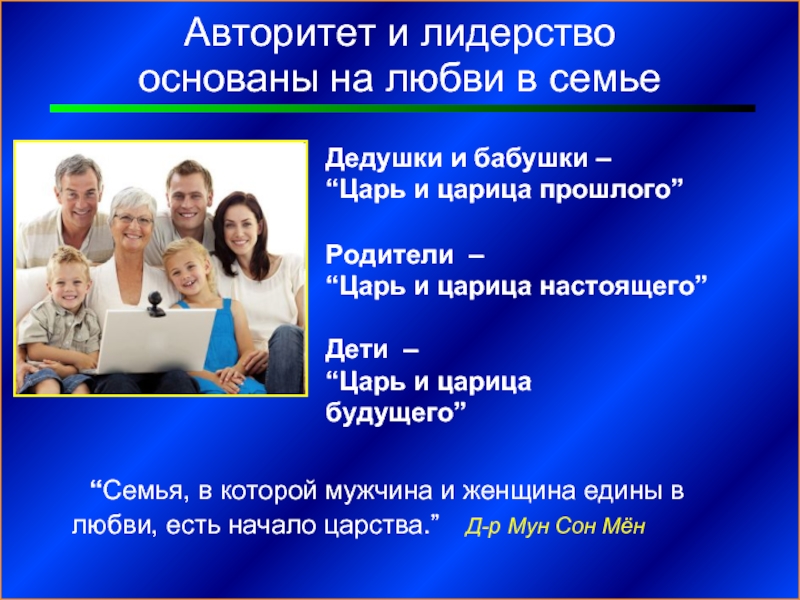 “Семья, в которой мужчина и женщина едины в любви, есть начало царства.” Д-р Мун Сон Мён