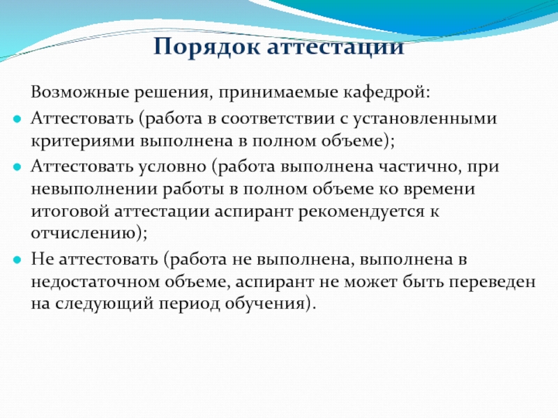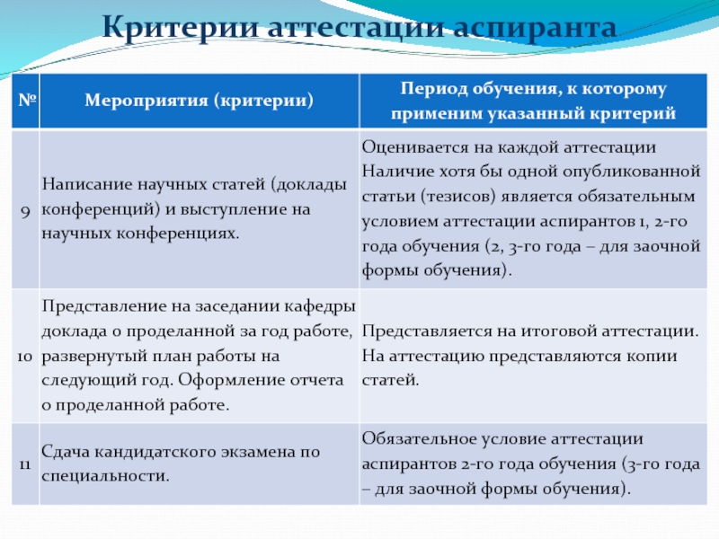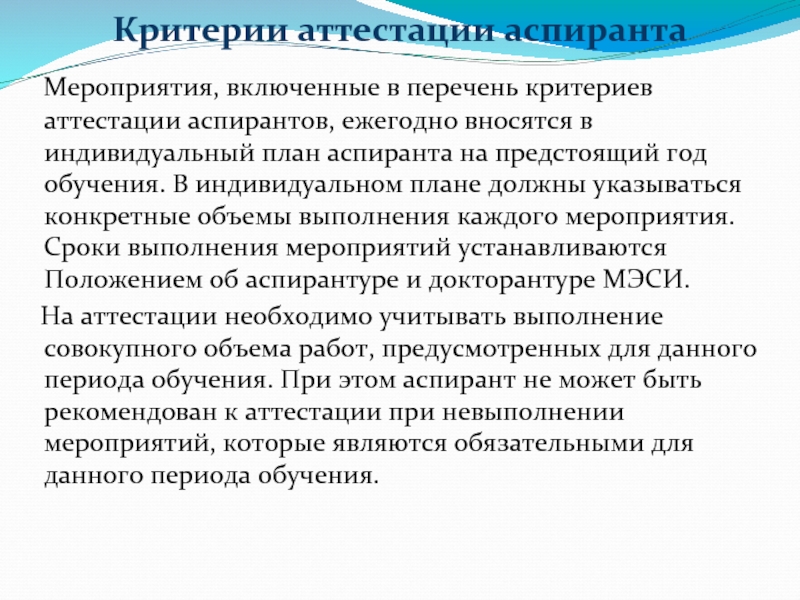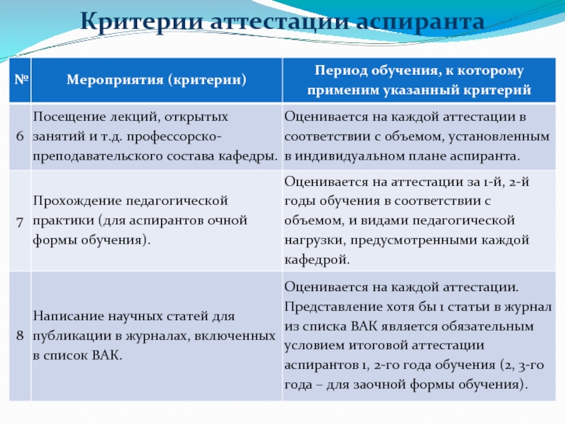 На аттестации необходимо учитывать выполнение совокупного объема работ, предусмотренных для данного периода обучения. При этом аспирант не может быть рекомендован к аттестации при невыполнении мероприятий, которые являются обязательными для данного периода обучения.