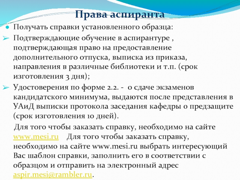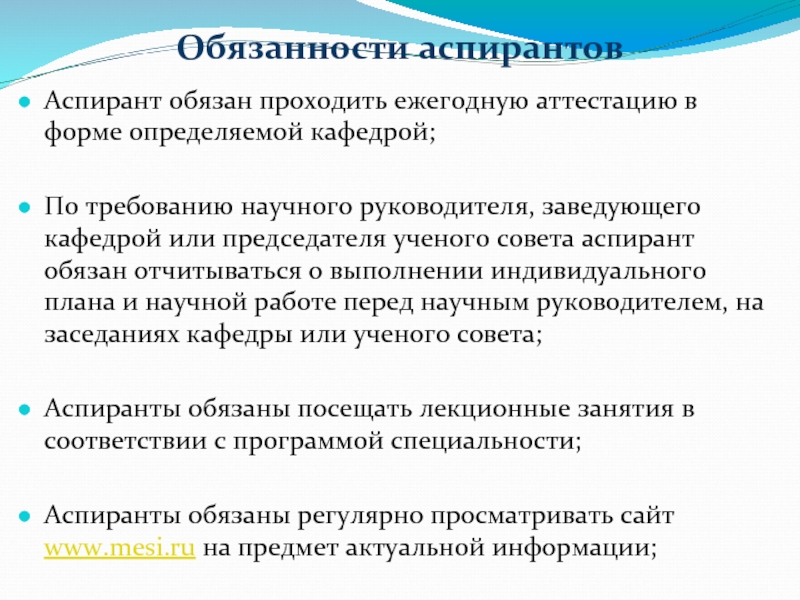Аспиранты обязаны регулярно просматривать сайт www.mesi.ru на предмет актуальной информации;