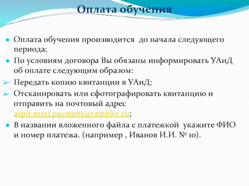 Отсканировать или сфотографировать квитанцию и отправить на почтовый адрес aspir.mesi.payment@rambler.ru;