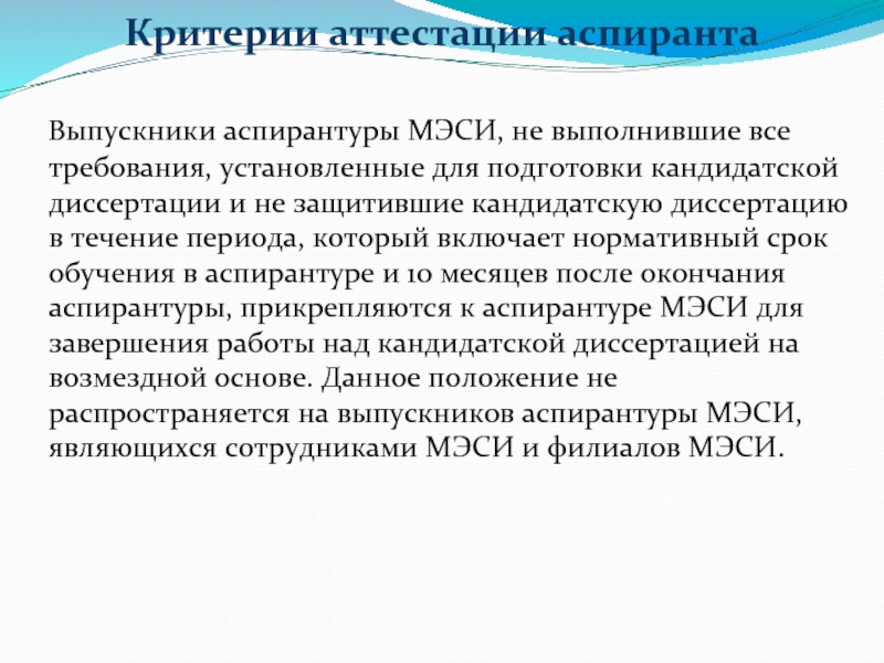 установленные для подготовки кандидатской диссертации и не защитившие кандидатскую диссертацию в течение периода, который включает нормативный срок обучения в аспирантуре и 10 месяцев после окончания аспирантуры, прикрепляются к аспирантуре МЭСИ для завершения работы над кандидатской диссертацией на возмездной основе. Данное положение не распространяется на выпускников аспирантуры МЭСИ, являющихся сотрудниками МЭСИ и филиалов МЭСИ.