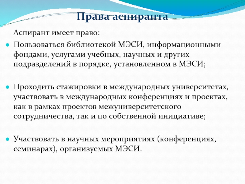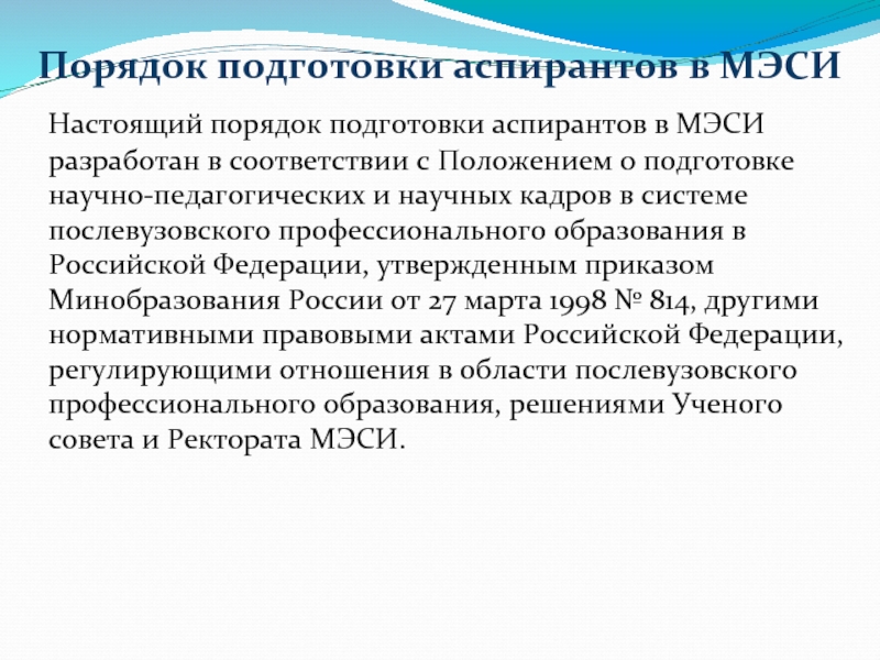 МЭСИ разработан в соответствии с Положением о подготовке научно-педагогических и научных кадров в системе послевузовского профессионального образования в Российской Федерации, утвержденным приказом Минобразования России от 27 марта 1998 № 814, другими нормативными правовыми актами Российской Федерации, регулирующими отношения в области послевузовского профессионального образования, решениями Ученого совета и Ректората МЭСИ.