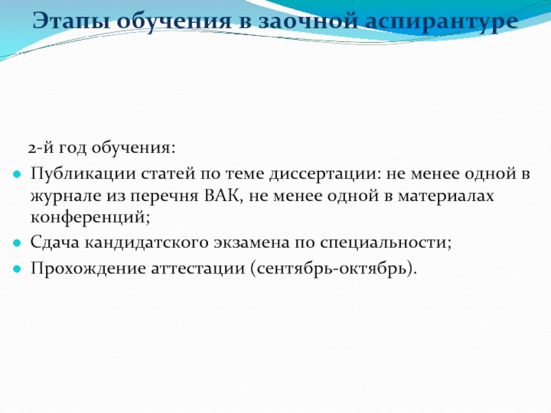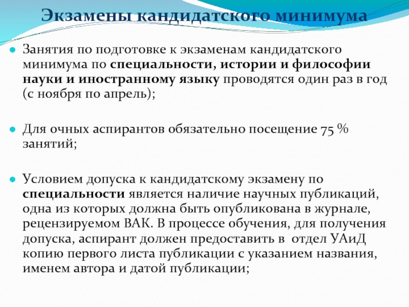 Условием допуска к кандидатскому экзамену по специальности является наличие научных публикаций, одна из которых должна быть опубликована в журнале, рецензируемом ВАК. В процессе обучения, для получения допуска, аспирант должен предоставить в отдел УАиД копию первого листа публикации с указанием названия, именем автора и датой публикации;
