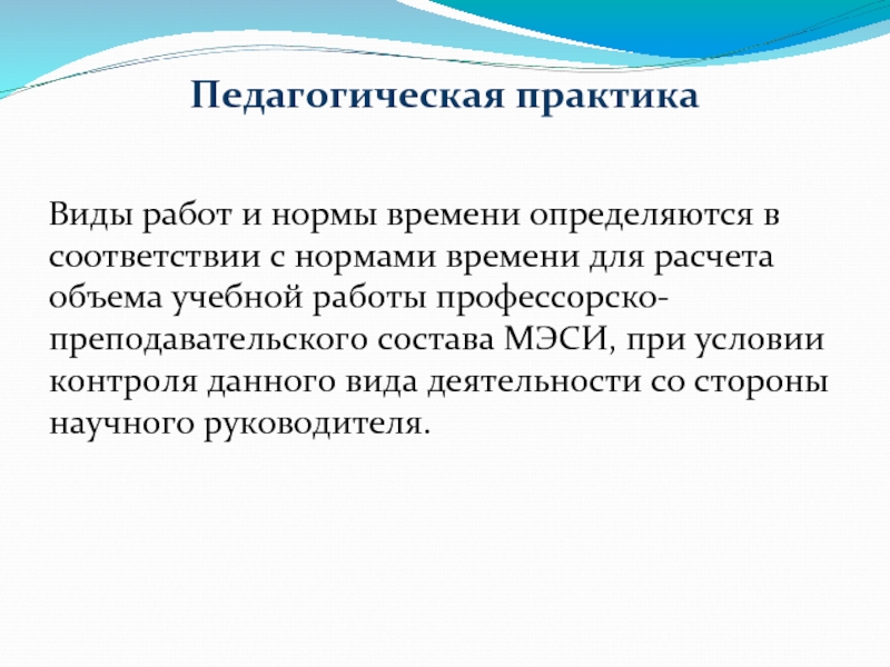 с нормами времени для расчета объема учебной работы профессорско-преподавательского состава МЭСИ, при условии контроля данного вида деятельности со стороны научного руководителя.