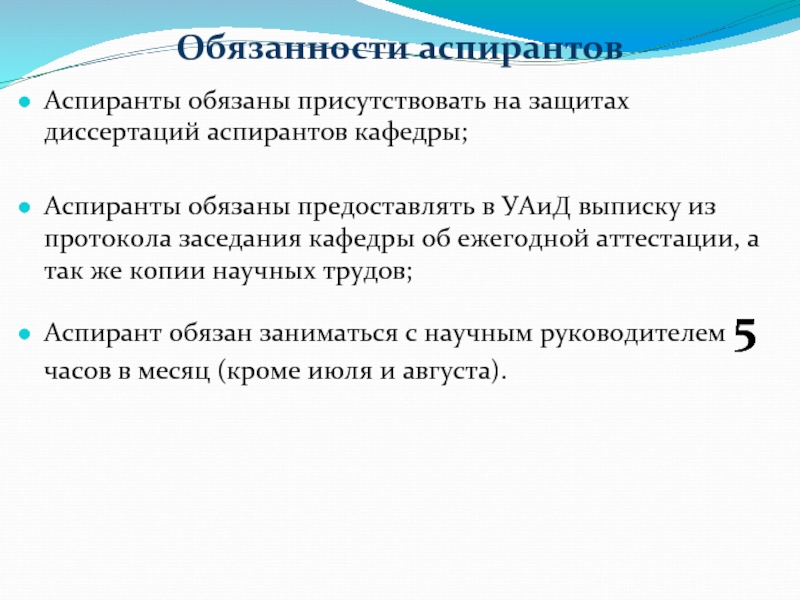 Аспирант обязан заниматься с научным руководителем 5 часов в месяц (кроме июля и августа).