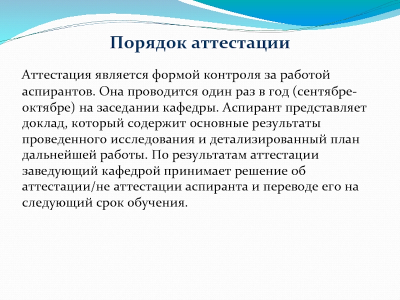 проводится один раз в год (сентябре-октябре) на заседании кафедры. Аспирант представляет доклад, который содержит основные результаты проведенного исследования и детализированный план дальнейшей работы. По результатам аттестации заведующий кафедрой принимает решение об аттестации/не аттестации аспиранта и переводе его на следующий срок обучения.