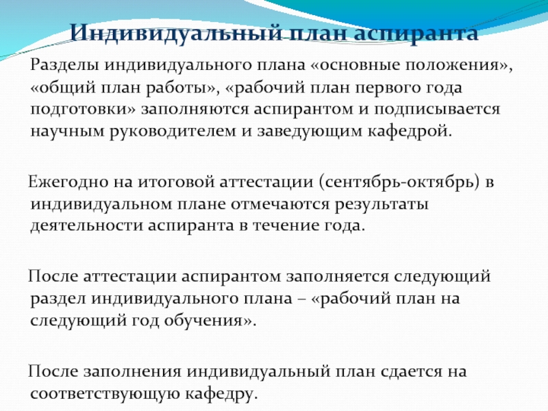 В индивидуальном плане определяются конкретные объемы и направления деятельности аспиранта и сроки реализации обучения в аспирантуре и критерии аттестации аспиранта.