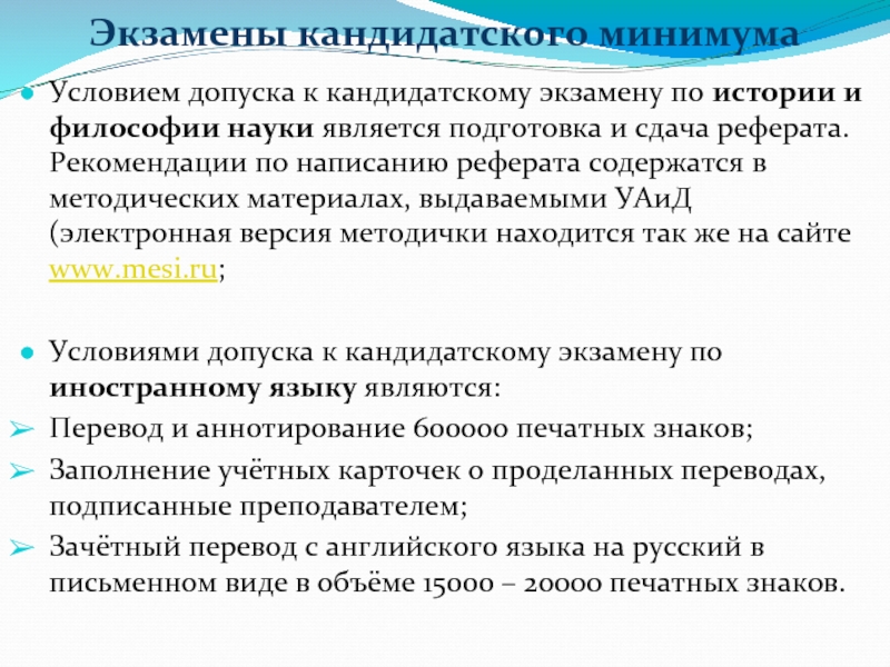 К кандидатским экзаменам по специальности, истории и философии науки и иностранному языку необходимо получить допуск;