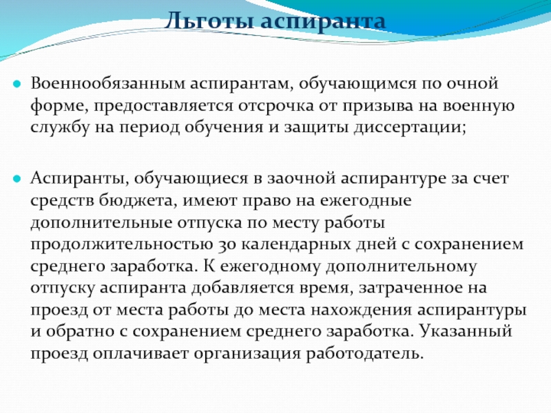Аспиранты, обучающиеся в заочной аспирантуре за счет средств бюджета, имеют право на ежегодные дополнительные отпуска по месту работы продолжительностью 30 календарных дней с сохранением среднего заработка. К ежегодному дополнительному отпуску аспиранта добавляется время, затраченное на проезд от места работы до места нахождения аспирантуры и обратно с сохранением среднего заработка. Указанный проезд оплачивает организация работодатель.