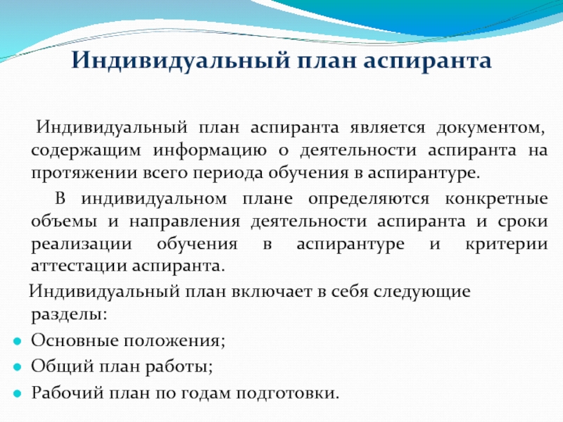 Индивидуальный план аспиранта является документом, содержащим информацию о
