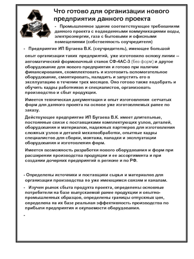 Действующее предприятие ИП Бугаева имеет длительные, постоянные связи с поставщиками комплектующих узлов, оборудования и материалов, надежных партнеров для изготовления сложных узлов и деталей механобработки, опытные кадры специалистов для сборки, монтажа, наладки и эксплуатации оборудования и изготовления форм и готово при наличии финансирования, скомплектовать и изготовить вспомогательное оборудование, смонтировать, наладить и запустить его в эксплуатацию в течении двух месяцев. Оно готово также подобрать и обучить кадры работников и специалистов, организовать производство и сбыт продукции.