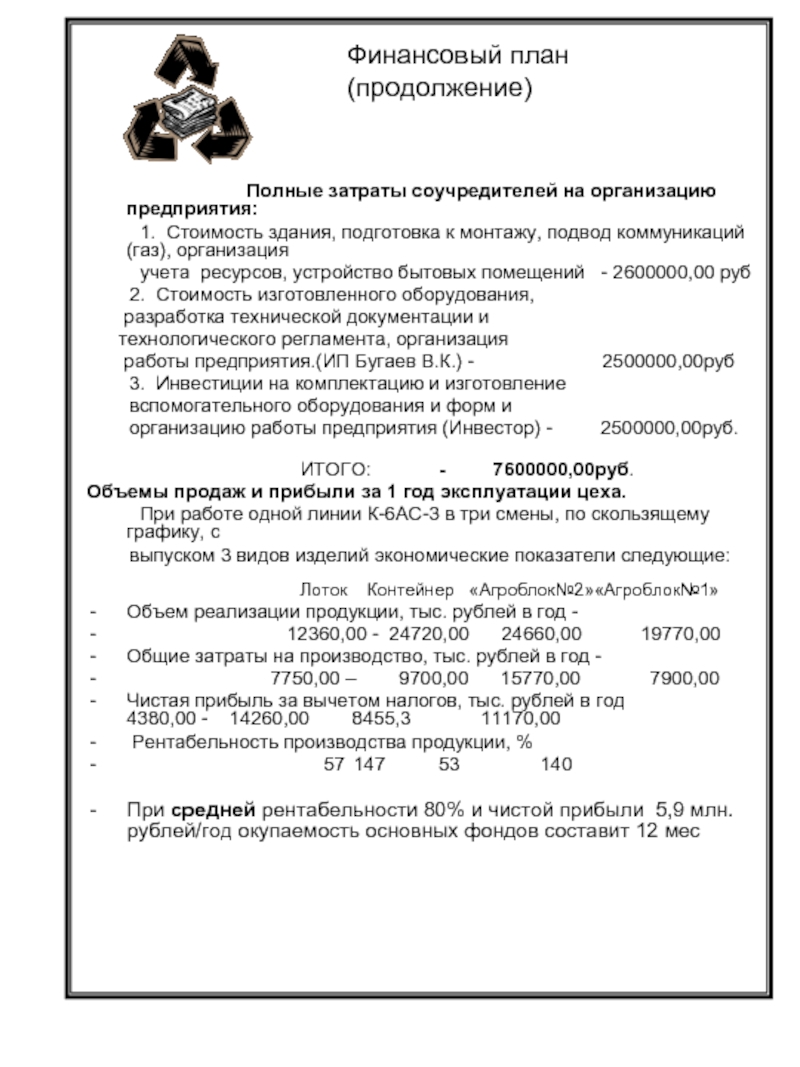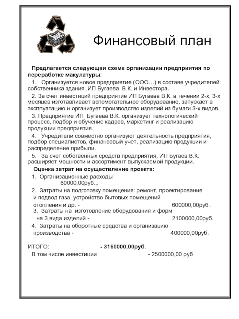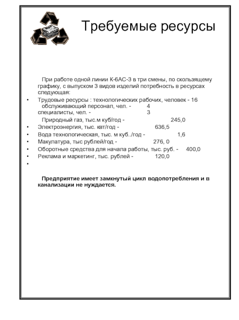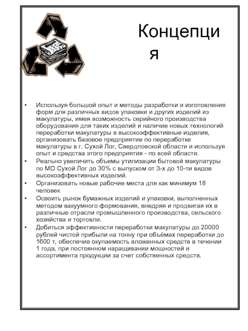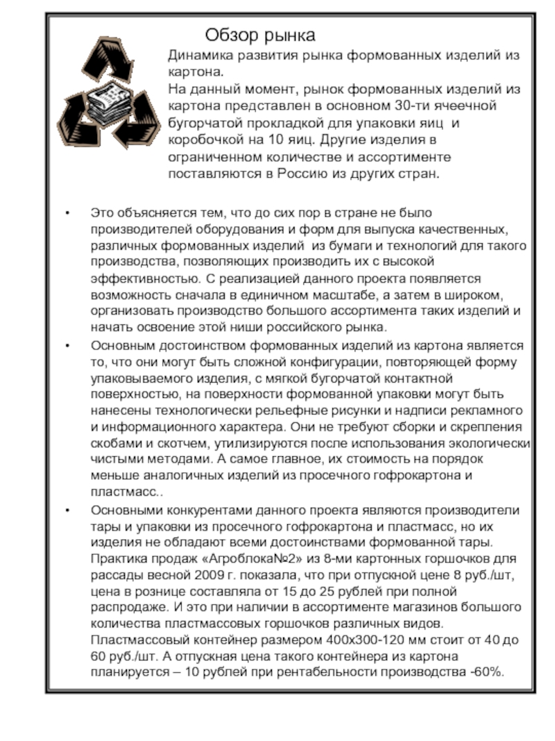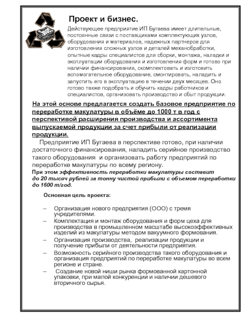 На этой основе предлагается создать базовое предприятие по переработке макулатуры в объёме до 1000 т в год с перспективой расширения производства и ассортимента выпускаемой продукции за счет прибыли от реализации продукции.