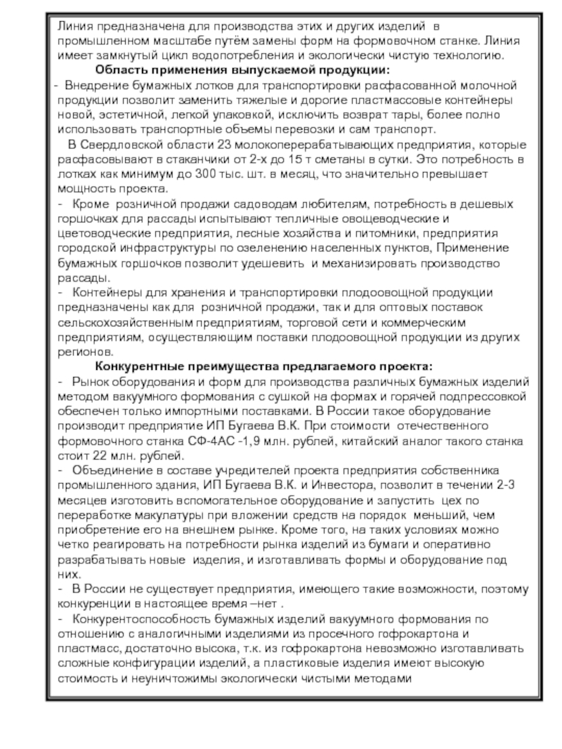 Предприятие ИП Бугаева В.К. (соучредитель), имеющее большой опыт организации таких предприятий, уже изготовило основу линии -- автоматический формовочный станок СФ-4АС-3 (без форм) и другое оборудование для нового предприятия и готово при наличии финансирования, скомплектовать и изготовить вспомогательное оборудование, смонтировать, наладить и запустить его в эксплуатацию в течении трех месяцев. Оно готово также подобрать и обучить кадры работников и специалистов, организовать производство и сбыт продукции.
