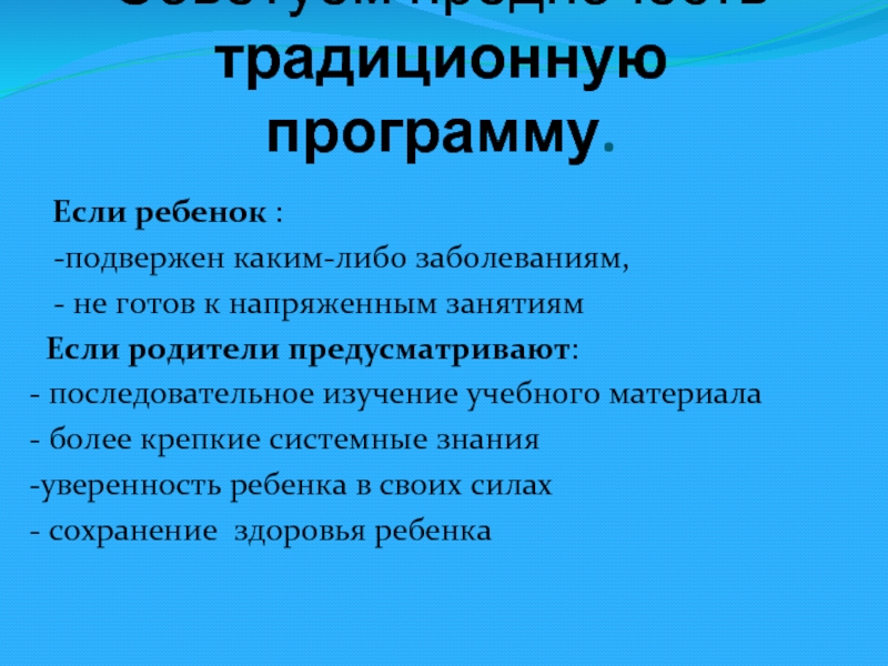 Если же малыш подвержен простудным заболеваниям, не готов к напряженным занятиям - лучше предпочесть традиционную программу.