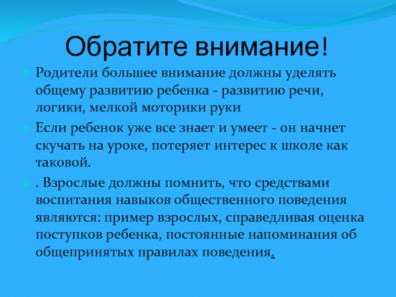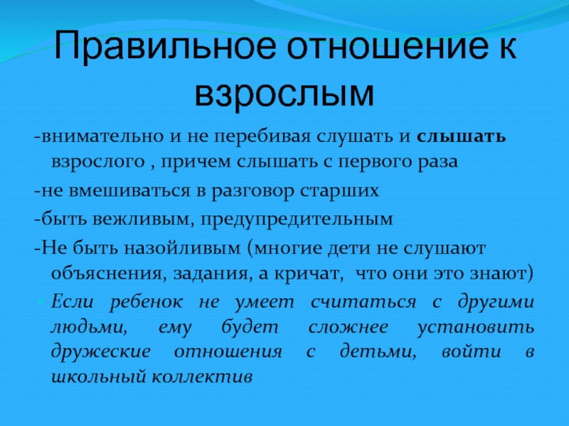 -Не быть назойливым (многие дети не слушают объяснения, задания, а кричат, что они это знают)