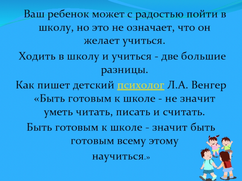 Как пишет детский психолог Л.А. Венгер «Быть готовым к школе - не значит уметь читать, писать и считать.