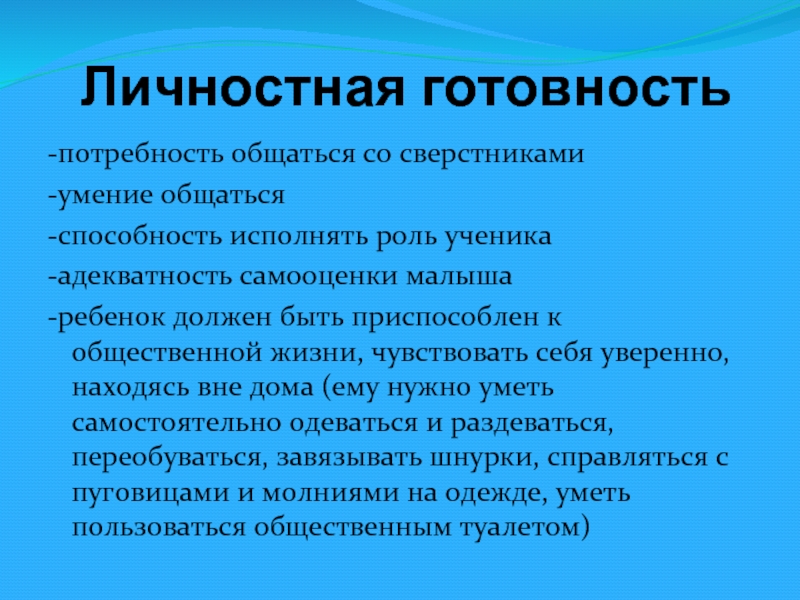 -ребенок должен быть приспособлен к общественной жизни, чувствовать себя уверенно, находясь вне дома (ему нужно уметь самостоятельно одеваться и раздеваться, переобуваться, завязывать шнурки, справляться с пуговицами и молниями на одежде, уметь пользоваться общественным туалетом)