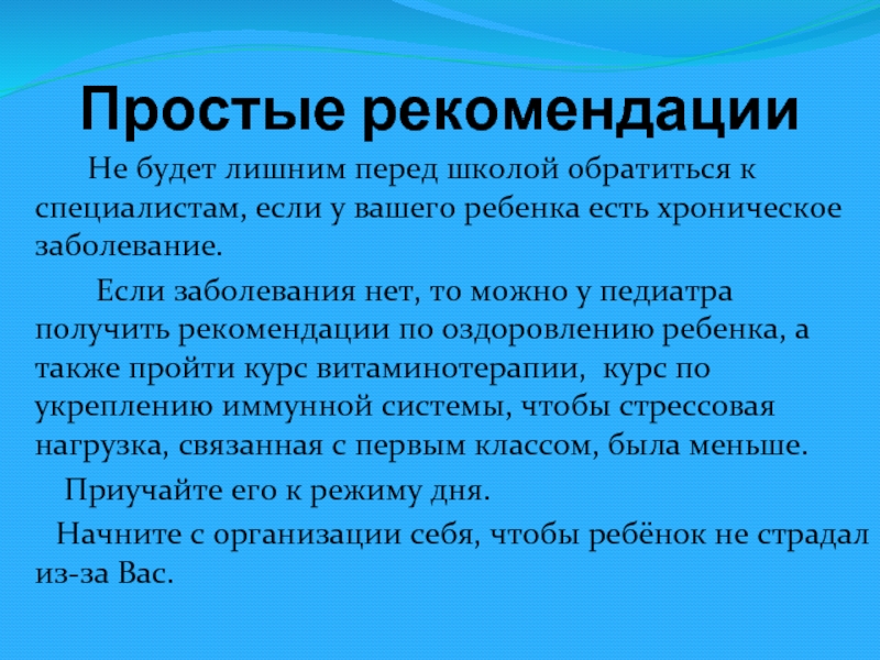 Если заболевания нет, то можно у педиатра получить рекомендации по оздоровлению ребенка, а также пройти курс витаминотерапии, курс по укреплению иммунной системы, чтобы стрессовая нагрузка, связанная с первым классом, была меньше.