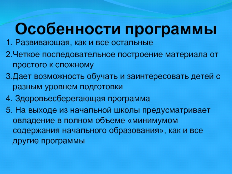 5. На выходе из начальной школы предусматривает овладение в полном объеме «минимумом содержания начального образования», как и все другие программы