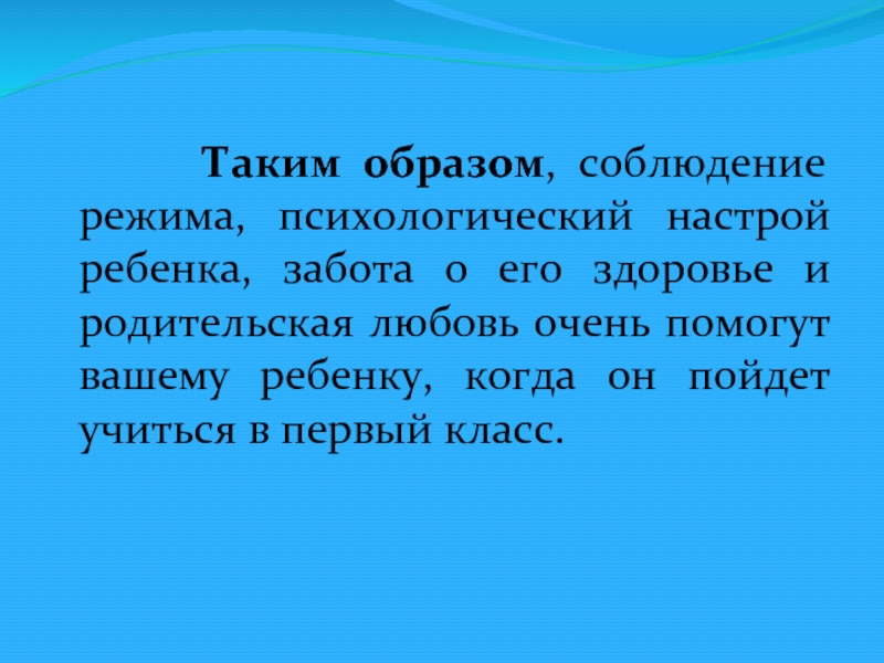 образом, соблюдение режима, психологический настрой ребенка, забота о его здоровье и родительская любовь очень помогут вашему ребенку, когда он пойдет учиться в первый класс.