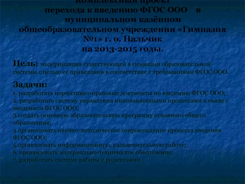 Цель: модернизация существующей в гимназии образовательной системы с целью ее приведения в соответствие с требованиями ФГОС ООО.