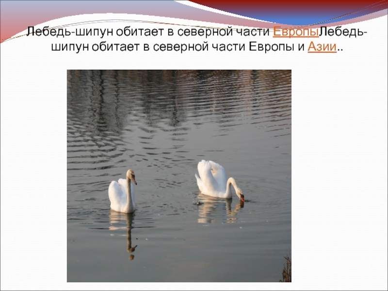 Слайд 6 Лебедь-шипун обитает в северной части ЕвропыЛебедь-шипун обитает в северной части Европы