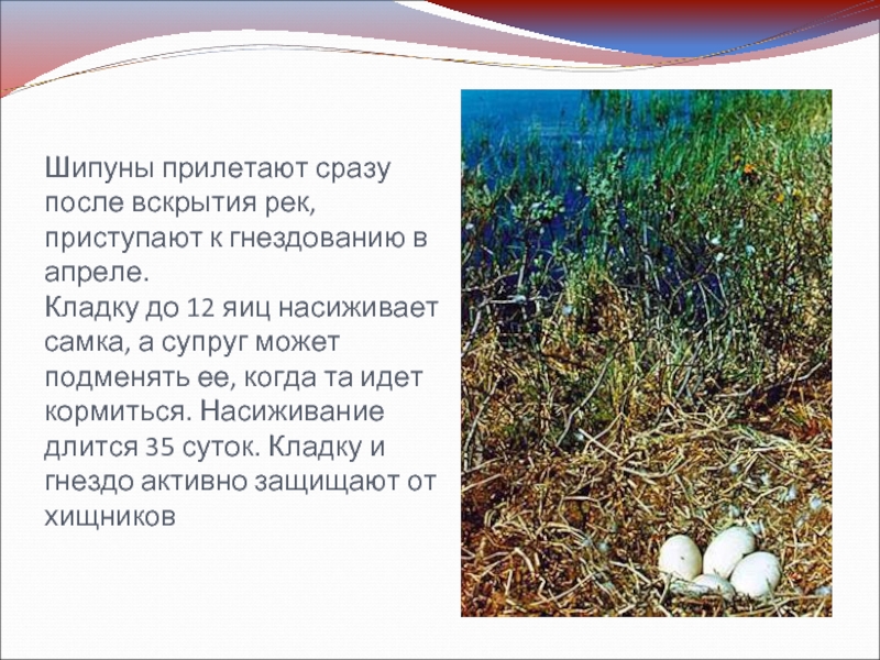 Слайд 8Шипуны прилетают сразу после вскрытия рек, приступают к гнездованию в апреле.