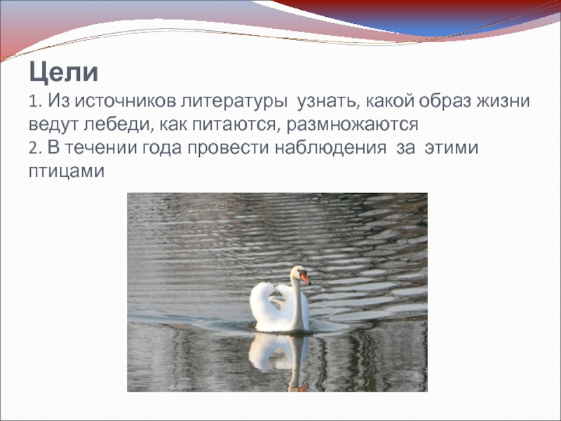Слайд 3 Цели 1. Из источников литературы узнать, какой образ жизни ведут лебеди, как