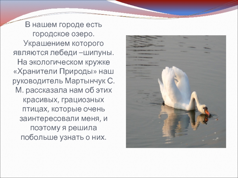 Слайд 2В нашем городе есть городское озеро. Украшением которого являются лебеди –шипуны.