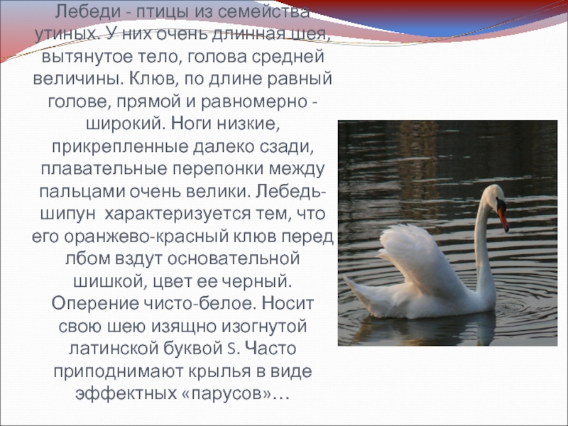 Слайд 5Лебеди - птицы из семейства утиных. У них очень длинная шея,