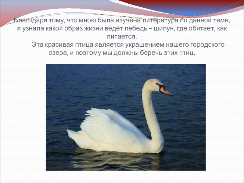узнала какой образ жизни ведёт лебедь – шипун, где обитает, как питается. Эта красивая птица является украшением нашего городского озера, и поэтому мы должны беречь этих птиц.