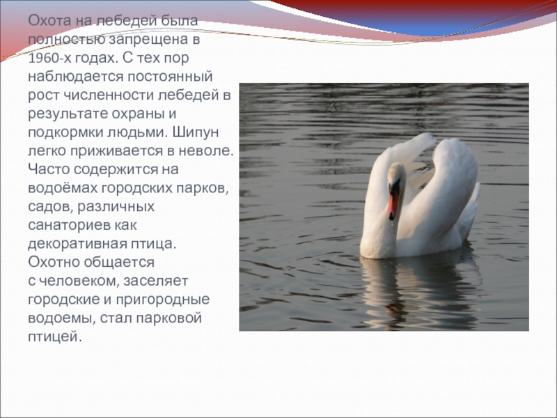 Слайд 9Охота на лебедей была полностью запрещена в 1960-х годах. С тех