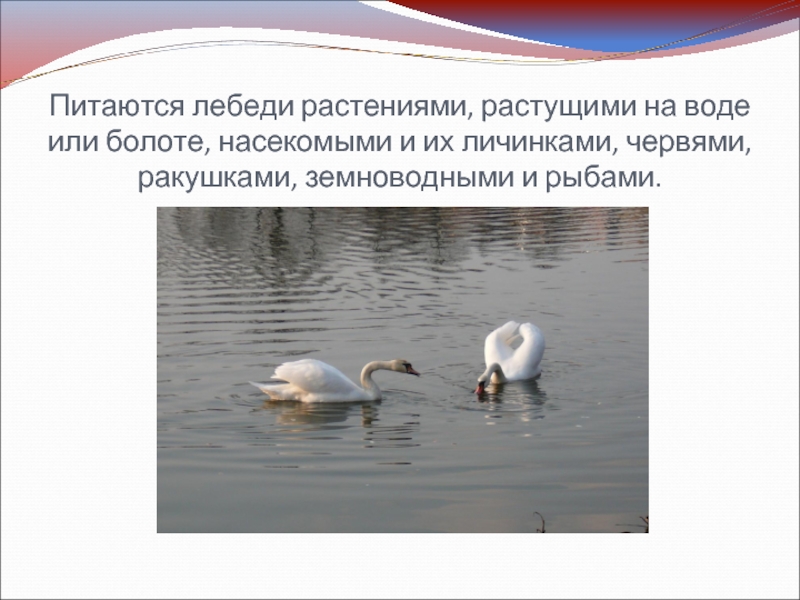 Слайд 7Питаются лебеди растениями, растущими на воде или болоте, насекомыми и их
