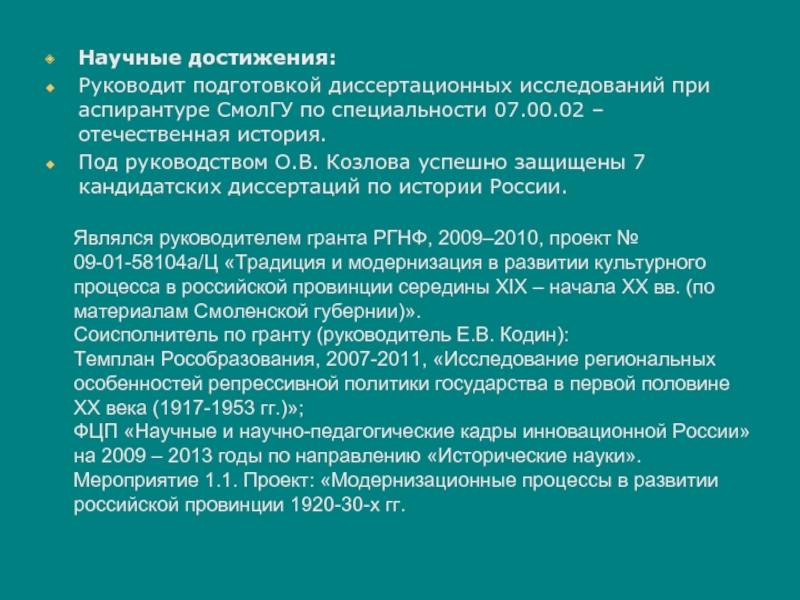 Являлся руководителем гранта РГНФ, 2009–2010, проект № 09-01-58104а/Ц «Традиция и модернизация в развитии культурного процесса в российской провинции середины XIX – начала ХХ вв. (по материалам Смоленской губернии)».