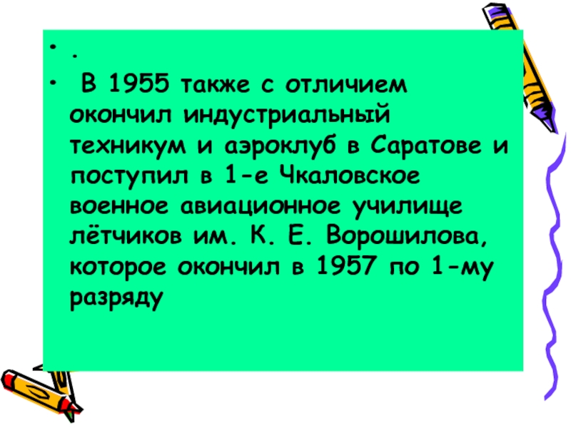 В 1955 также с отличием окончил индустриальный техникум и аэроклуб