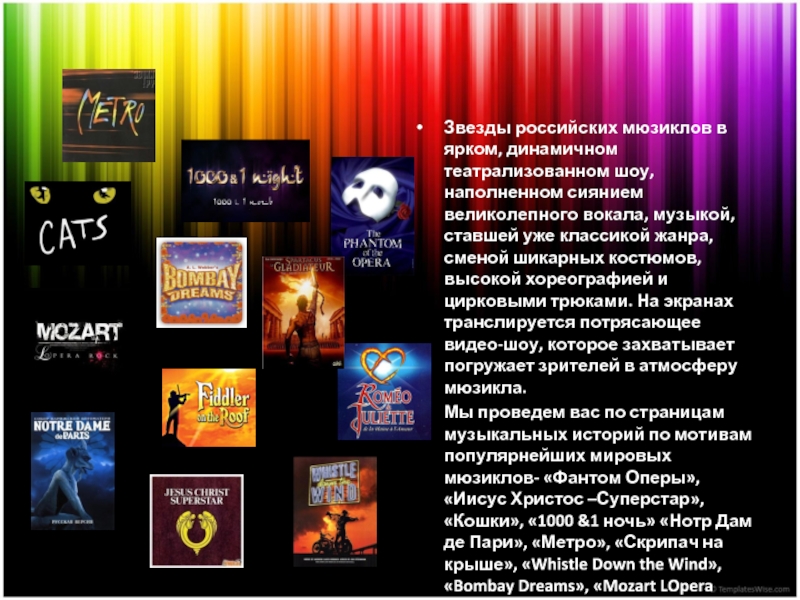 Мы проведем вас по страницам музыкальных историй по мотивам популярнейших мировых мюзиклов- «Фантом Оперы», «Иисус Христос –Суперстар», «Кошки», «1000 &1 ночь» «Нотр Дам де Пари», «Метро», «Скрипач на крыше», «Whistle Down the Wind», «Bombay Dreams», «Mozart LOpera Rock» …