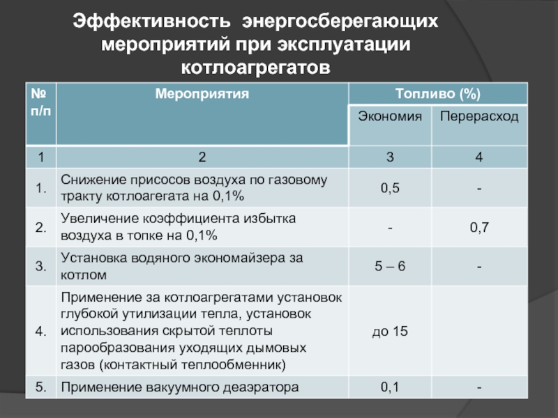 Слайд 7Эффективность энергосберегающих мероприятий при эксплуатации котлоагрегатов