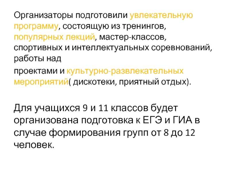 Слайд 5Организаторы подготовили увлекательную программу, состоящую из тренингов, популярных лекций, мастер-классов, спортивных