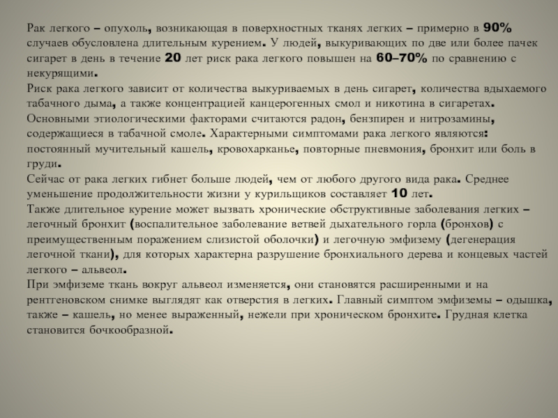в 90% случаев обусловлена длительным курением. У людей, выкуривающих по две или более пачек сигарет в день в течение 20 лет риск рака легкого повышен на 60–70% по сравнению с некурящими.