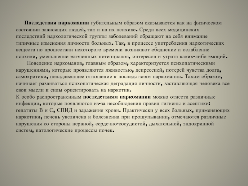 состоянии зависящих людей, так и на их психике. Среди всех медицинских последствий наркологической группы заболеваний обращают на себя внимание типичные изменения личности больных. Так, в процессе употребления наркотических веществ по прошествии некоторого времени возникают обеднение и ослабление психики, уменьшение жизненных потенциалов, интересов и утрата каких-либо эмоций.