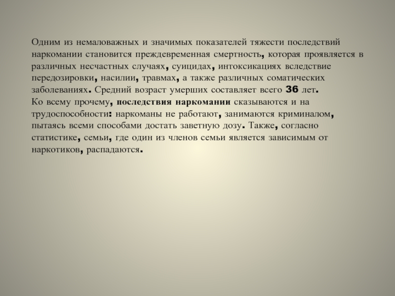 показателей тяжести последствий наркомании становится преждевременная смертность, которая проявляется в различных несчастных случаях, суицидах, интоксикациях вследствие передозировки, насилии, травмах, а также различных соматических заболеваниях. Средний возраст умерших составляет всего 36 лет.