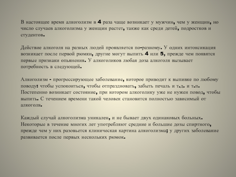 чем у женщин, но число случаев алкоголизма у женщин растет, также как среди детей, подростков и студентов.