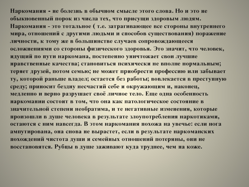 это не обыкновенный порок из числа тех, что присущи здоровым людям. Наркомания - это тотальное ( т.е. затрагивающее все стороны внутреннего мира, отношений с другими людьми и способов существования) поражение личности, к тому же в большинстве случаев сопровождающееся осложнениями со стороны физического здоровья. Это значит, что человек, идущий по пути наркомана, постепенно уничтожает свои лучшие нравственные качества; становиться психически не вполне нормальным; теряет друзей, потом семью; не может приобрести профессию или забывает ту, которой раньше владел; остается без работы; вовлекается в преступную среду; приносит бездну несчастий себе и окружающим и, наконец, медленно и верно разрушает своё личное тело. Еще одна особенность наркомании состоит в том, что она как патологическое состояние в значительной степени необратима, и те негативные изменения, которые произошли в душе человека в результате злоупотребления наркотиками, остаются с ним навсегда. В этом наркомания похожа на увечье: если нога ампутирована, она снова не вырастет, если в результате наркоманских похождений чистота души и семейных отношений потеряны, они не восстановятся. Рубцы в душе заживают куда труднее, чем на коже.
