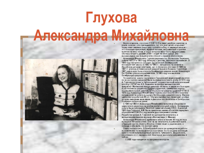 Александра Михайловна Глухова родилась в с. Выползово Порецкого района ЧАССР в 1952 году. Инвалид с детства, перенесла полеомилит. В 1959 году поступила в 1-й класс Дурасовской (Октябрьской) восьмилетней школы. С 1962 по 1966 гг. находилась на лечении в Ишлейском детском санатории, где и обучалась эти годы. С 1966 по 1967 гг. училась в Семеновской средней школе в 8 классе. 1 сентября 1967 года в селе была открыта Октябрьская средняя школа. Александра 9 и 10 класс училась в родном селе. В 1969 году она окончила Октябрьскую среднюю школу.