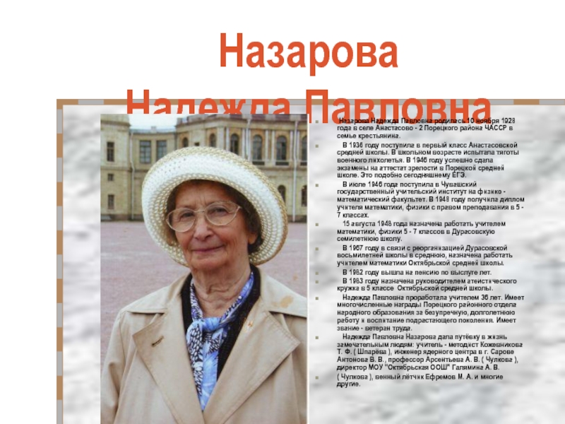 Надежда Павловна Назарова дала путёвку в жизнь замечательным людям: учитель - методист Кожевникова Т. Ф. ( Шпарёва ), инженер ядерного центра в г. Сарове Антонова В. В., профессор Арсентьева А. В. ( Чулкова ), директор МОУ "Октябрьская ООШ" Галямина А. В.