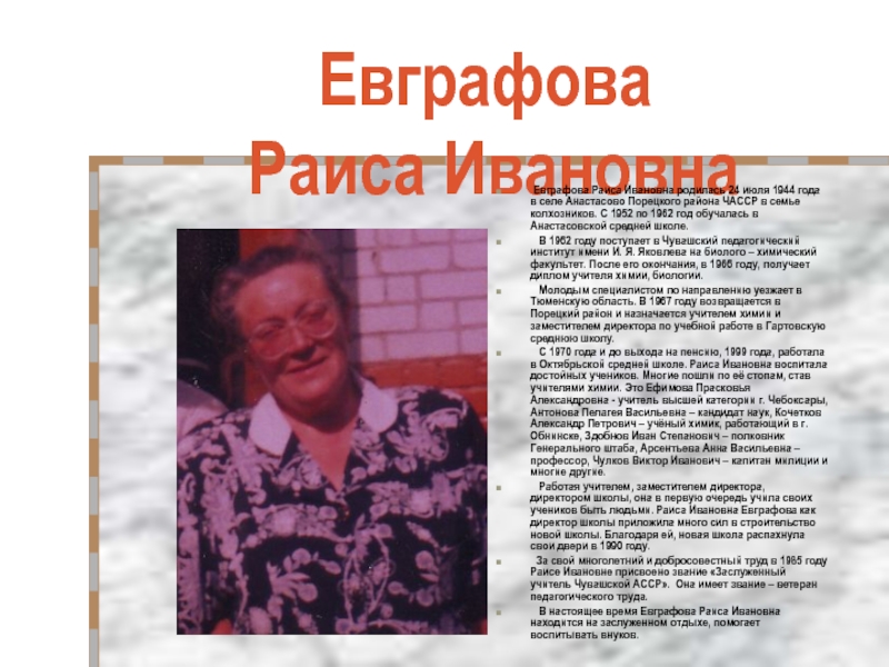 В настоящее время Евграфова Раиса Ивановна находится на заслуженном отдыхе, помогает воспитывать внуков.