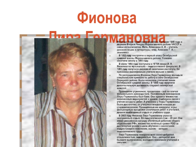 В 2003 году Фионова Лира Германовна ушла на заслуженный отдых. Её педагогический стаж – 35 лет. Она имеет российскую награду «Почётный работник общего образования РФ», множество почётных грамот РОО за достигнутые успехи в деле обучения и воспитания подрастающего поколения, звание - ветеран педагогического труда.