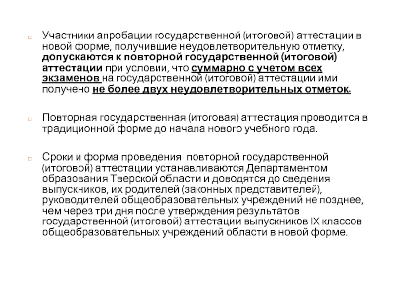 Сроки и форма проведения повторной государственной (итоговой) аттестации устанавливаются Департаментом образования Тверской области и доводятся до сведения выпускников, их родителей (законных представителей), руководителей общеобразовательных учреждений не позднее, чем через три дня после утверждения результатов государственной (итоговой) аттестации выпускников IX классов общеобразовательных учреждений области в новой форме.